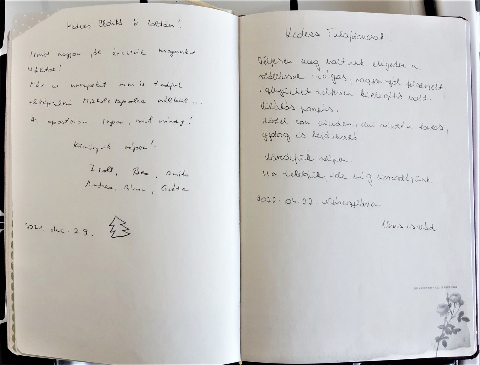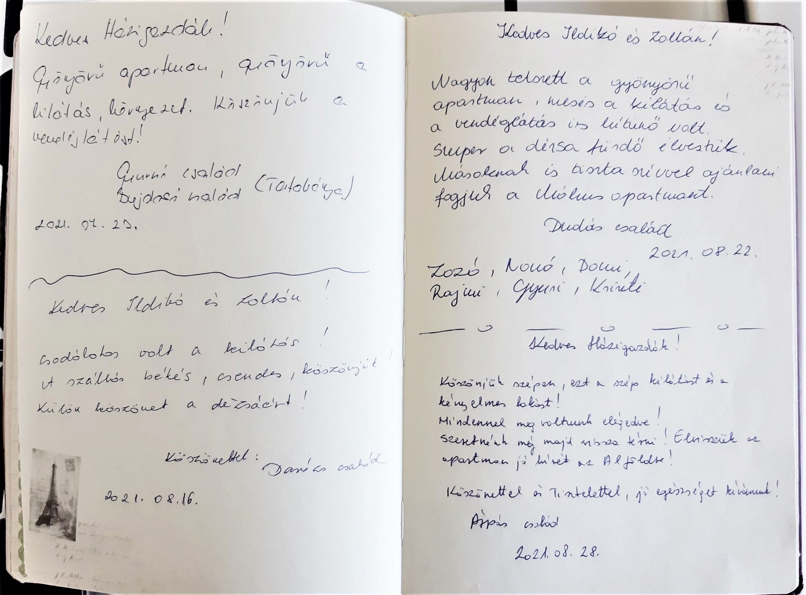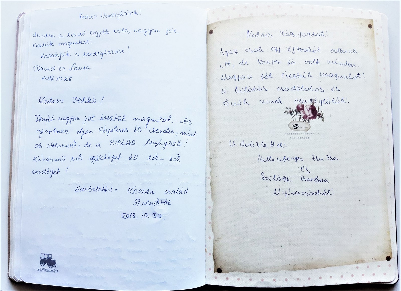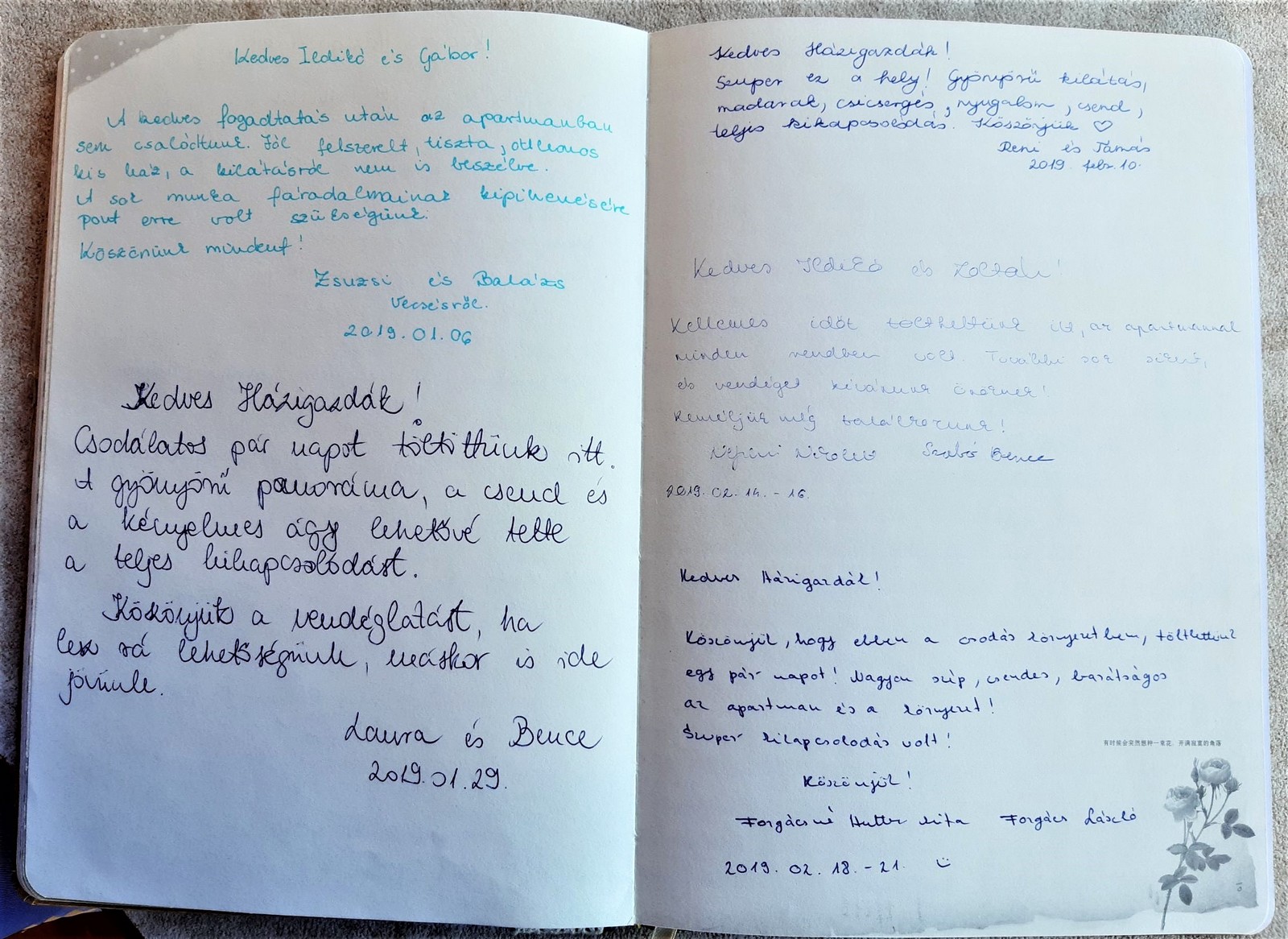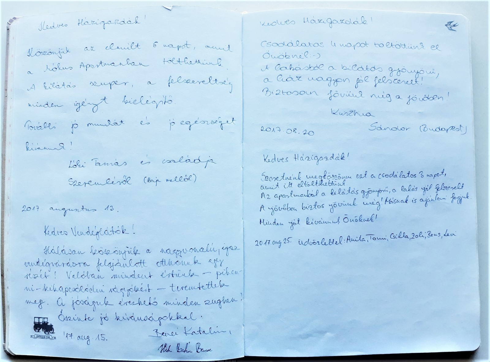 Tettünk egy-egy könyvecskét mindkét apartmanunkba, hogy vendégeink emléket, véleményt tudjanak hagyni. Mindig örömmel olvassuk, ha valaki ír néhány sort, ezeket most megosztom, lapozz bele. Régebbi írások is vannak, de mivel mindegyik nagyon kedves a számunkra, ezért egyet sem tudtam kihagyni :)