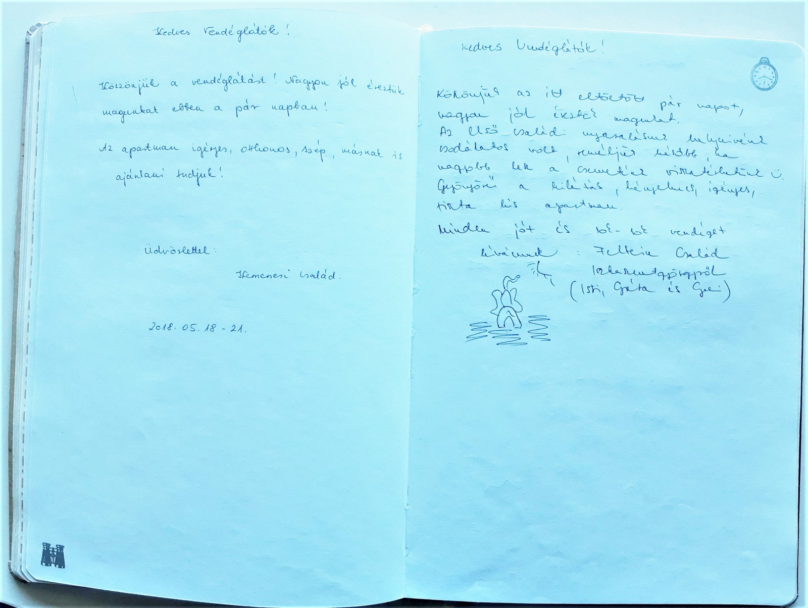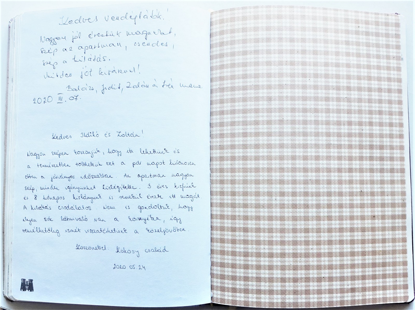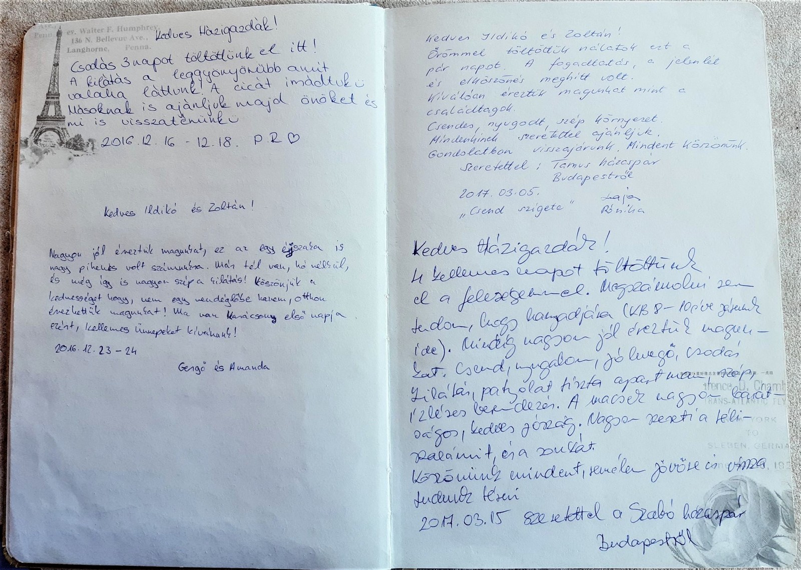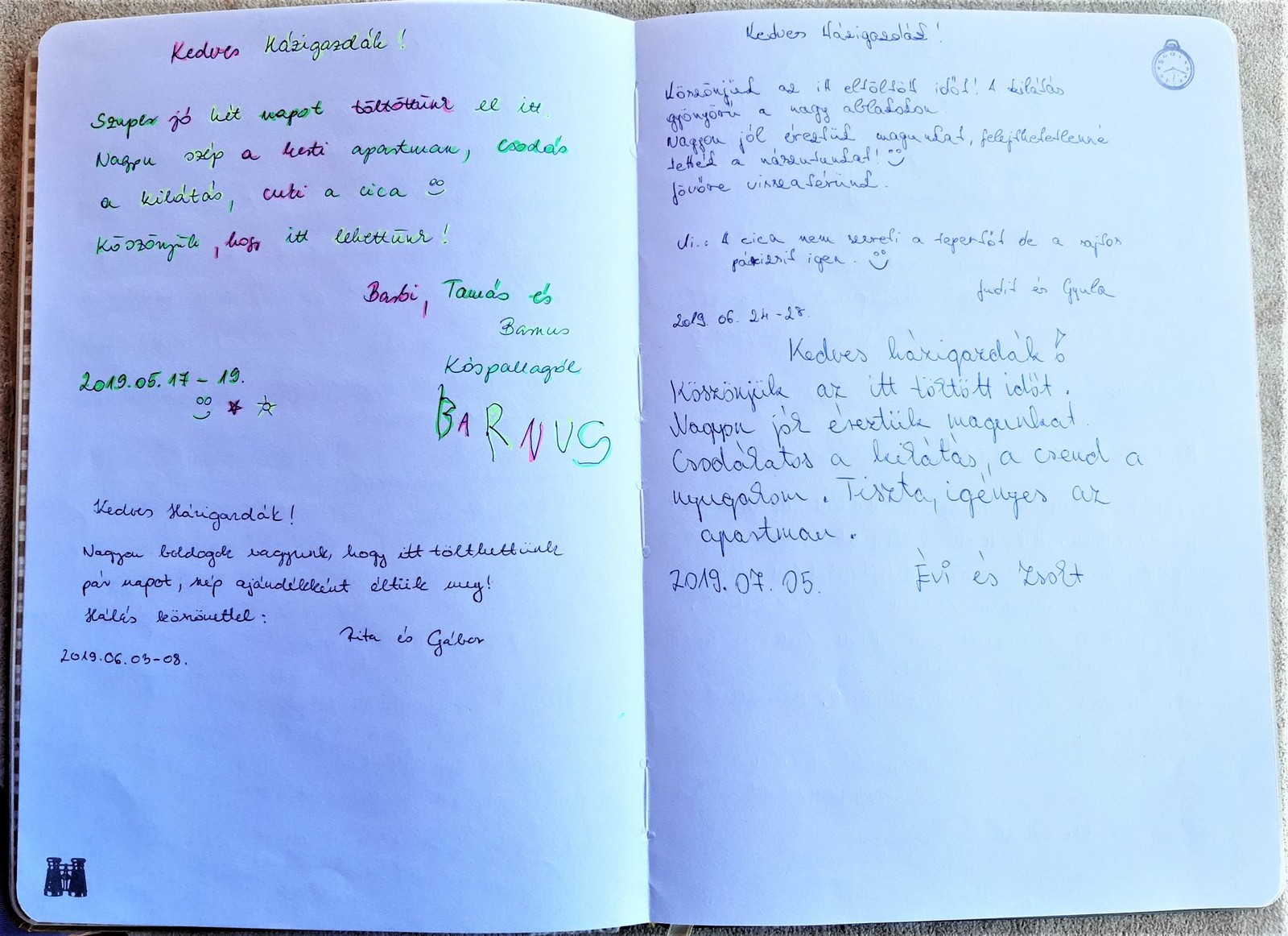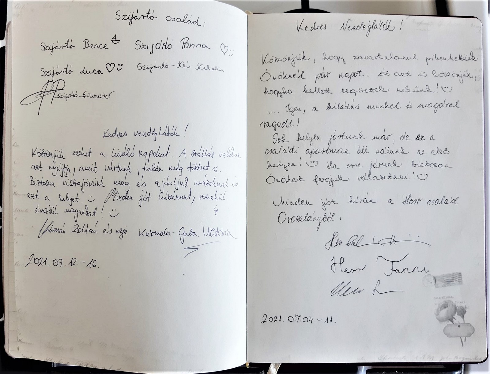 Tettünk egy-egy könyvecskét mindkét apartmanunkba, hogy vendégeink emléket, véleményt tudjanak hagyni. Mindig örömmel olvassuk, ha valaki ír néhány sort, ezeket most megosztom, lapozz bele. Régebbi írások is vannak, de mivel mindegyik nagyon kedves a számunkra, ezért egyet sem tudtam kihagyni :)
