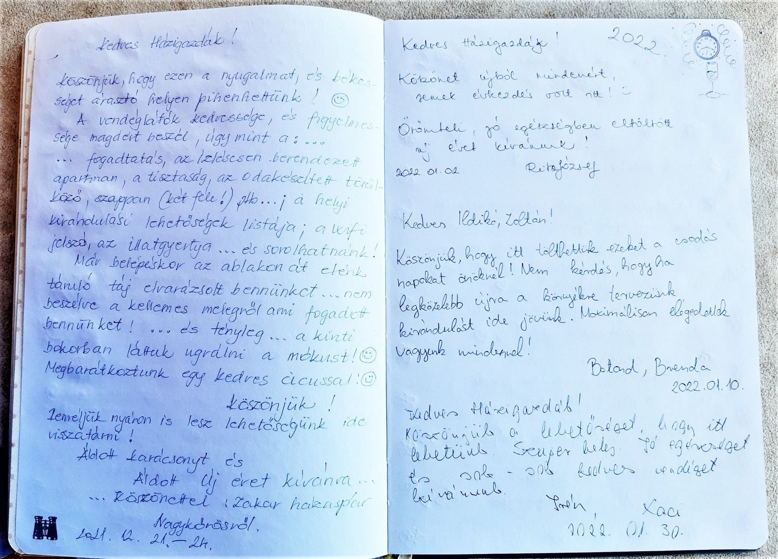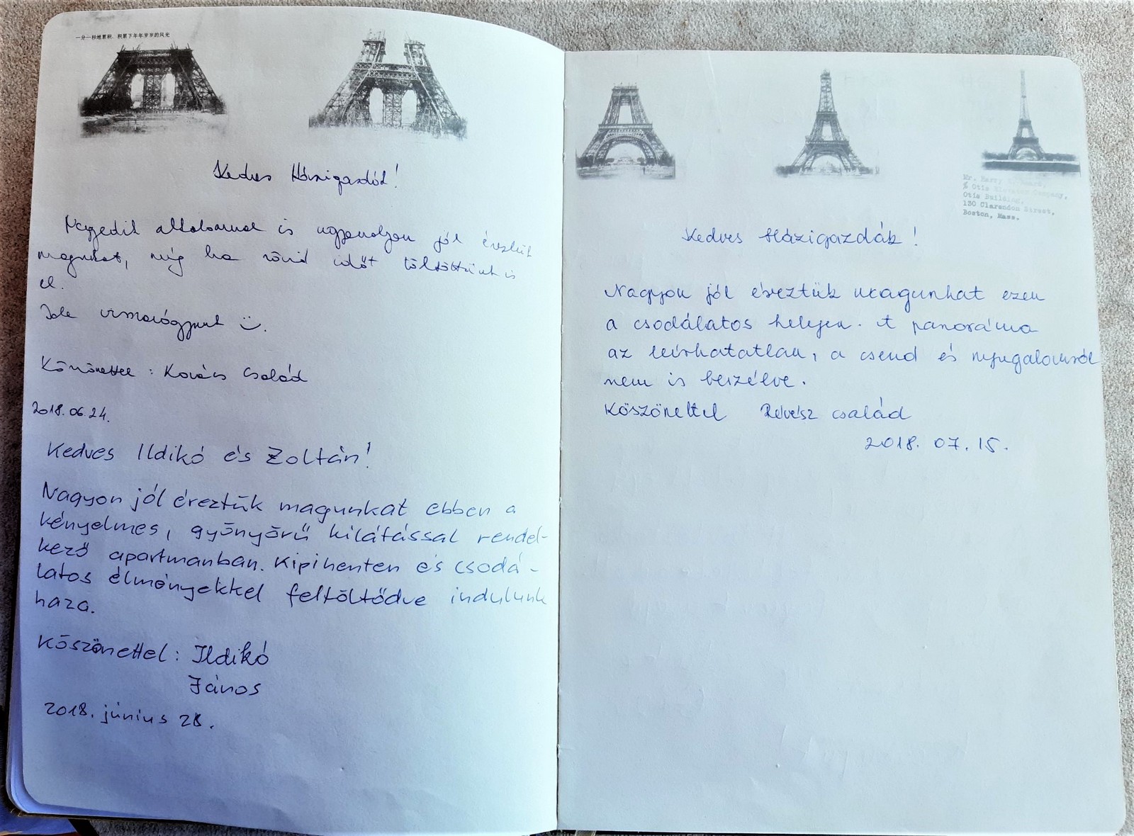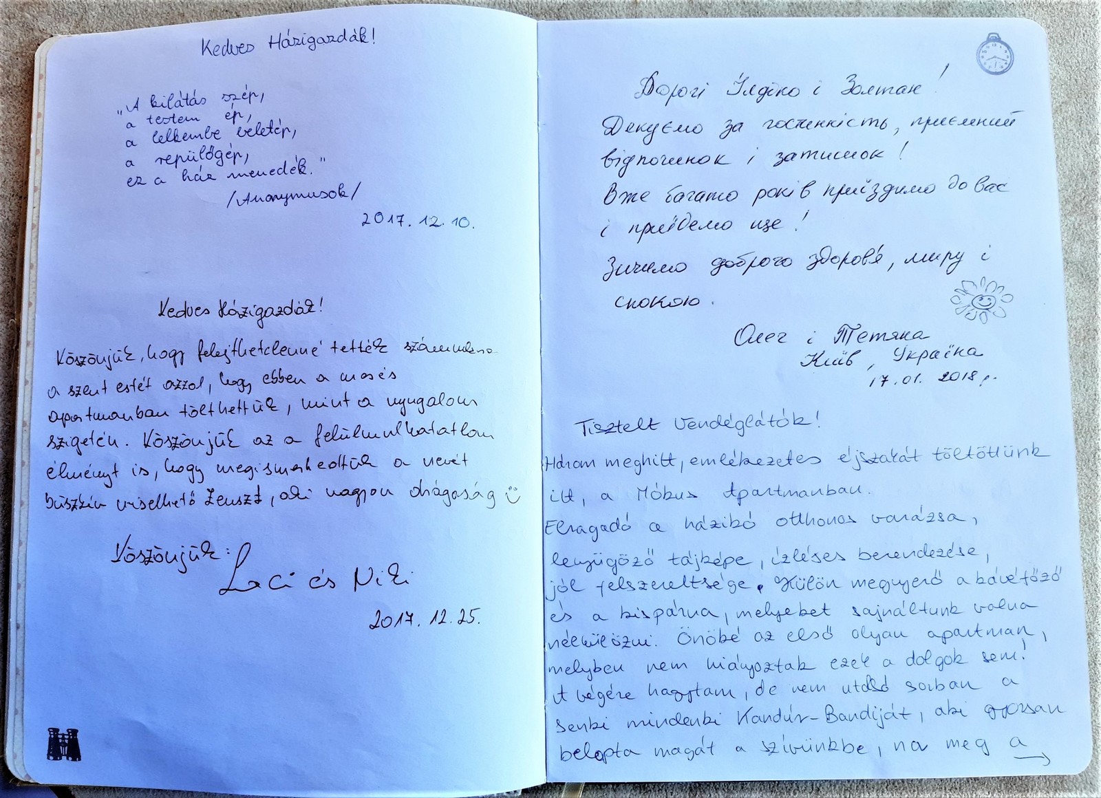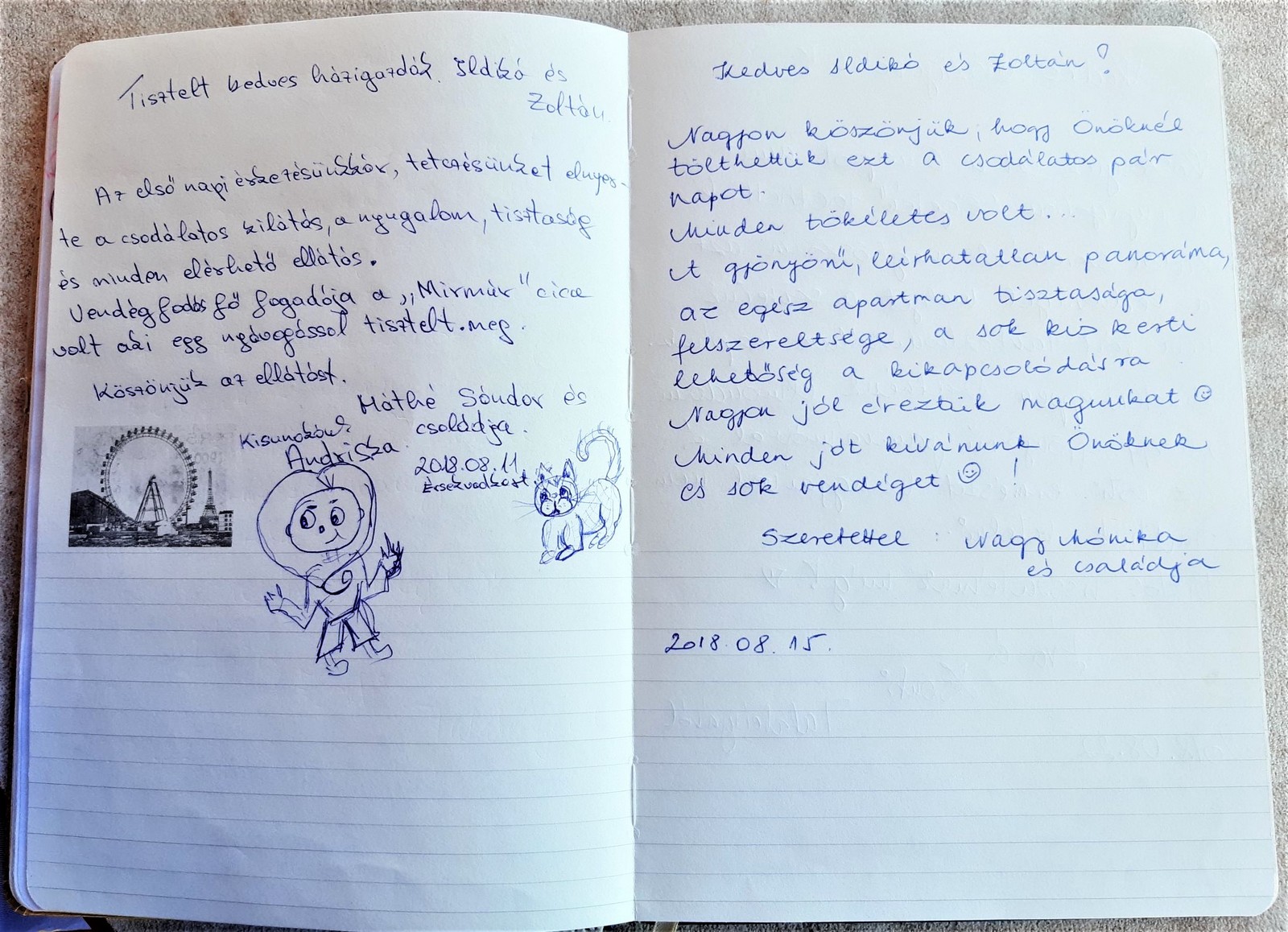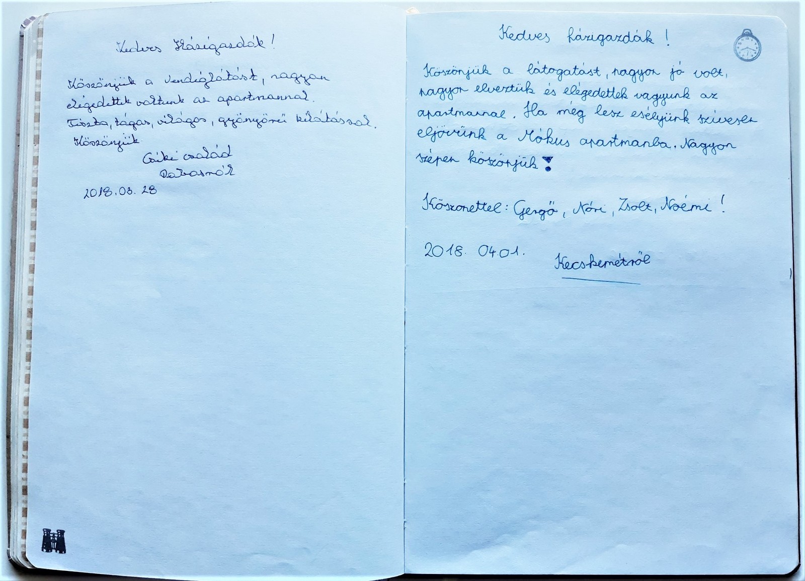 Tettünk egy-egy könyvecskét mindkét apartmanunkba, hogy vendégeink emléket, véleményt tudjanak hagyni. Mindig örömmel olvassuk, ha valaki ír néhány sort, ezeket most megosztom, lapozz bele. Régebbi írások is vannak, de mivel mindegyik nagyon kedves a számunkra, ezért egyet sem tudtam kihagyni :)
